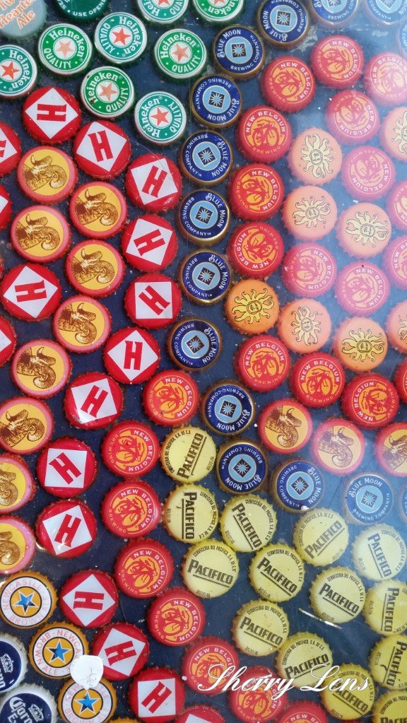 Bottle cap pattern underneath our glass table at the Magic Mushroom Pizza, downtown Charleston, South Carolina. Perfectly delicious! π Sun shining in on my rug, casting a perfect shadow pattern of the outside railing.Pattern swatches for a perfectly beautiful beach house~