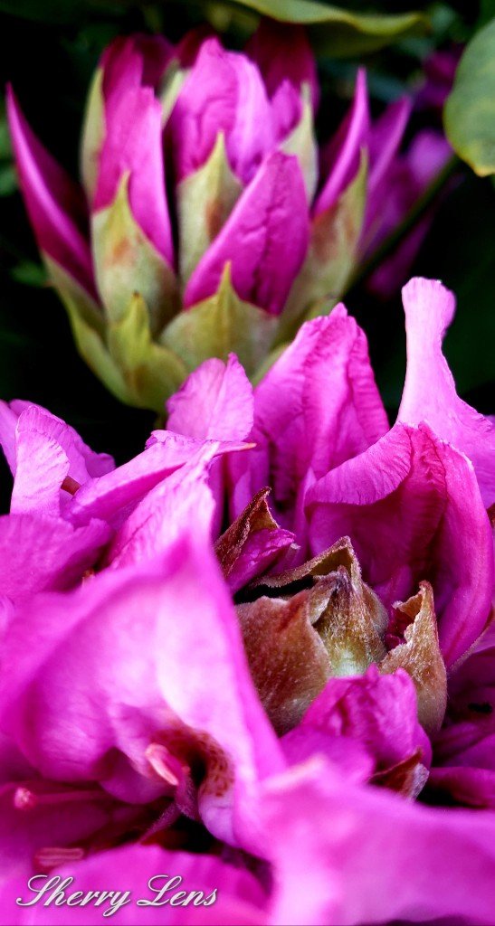 My husband’s Rhododendron. He planted it as just a starter beside our steps and it now stands over 6ft tall and at least that much or more around. I personally love this photo, it turned out better than I could have imagined not much editing at all.